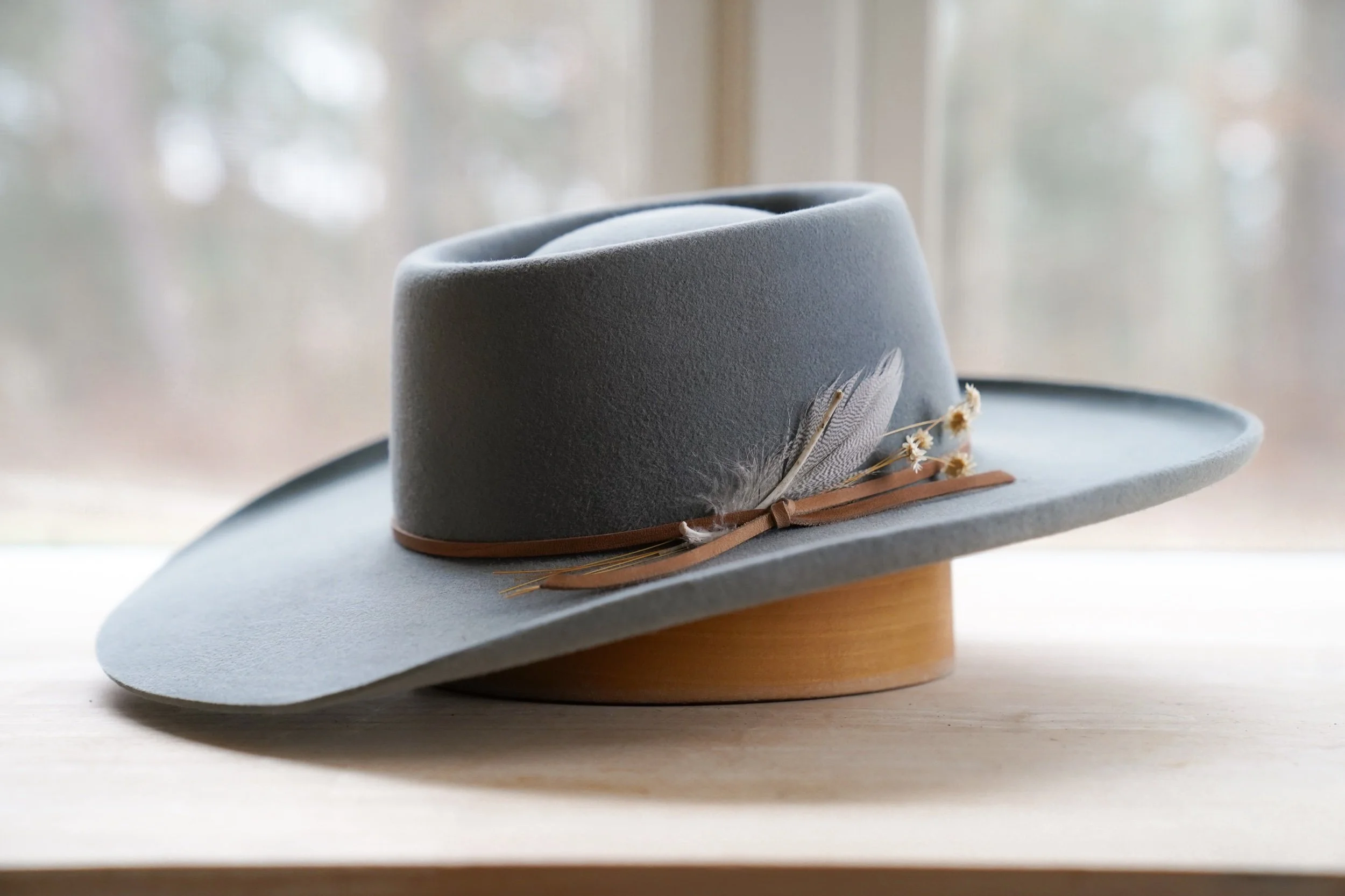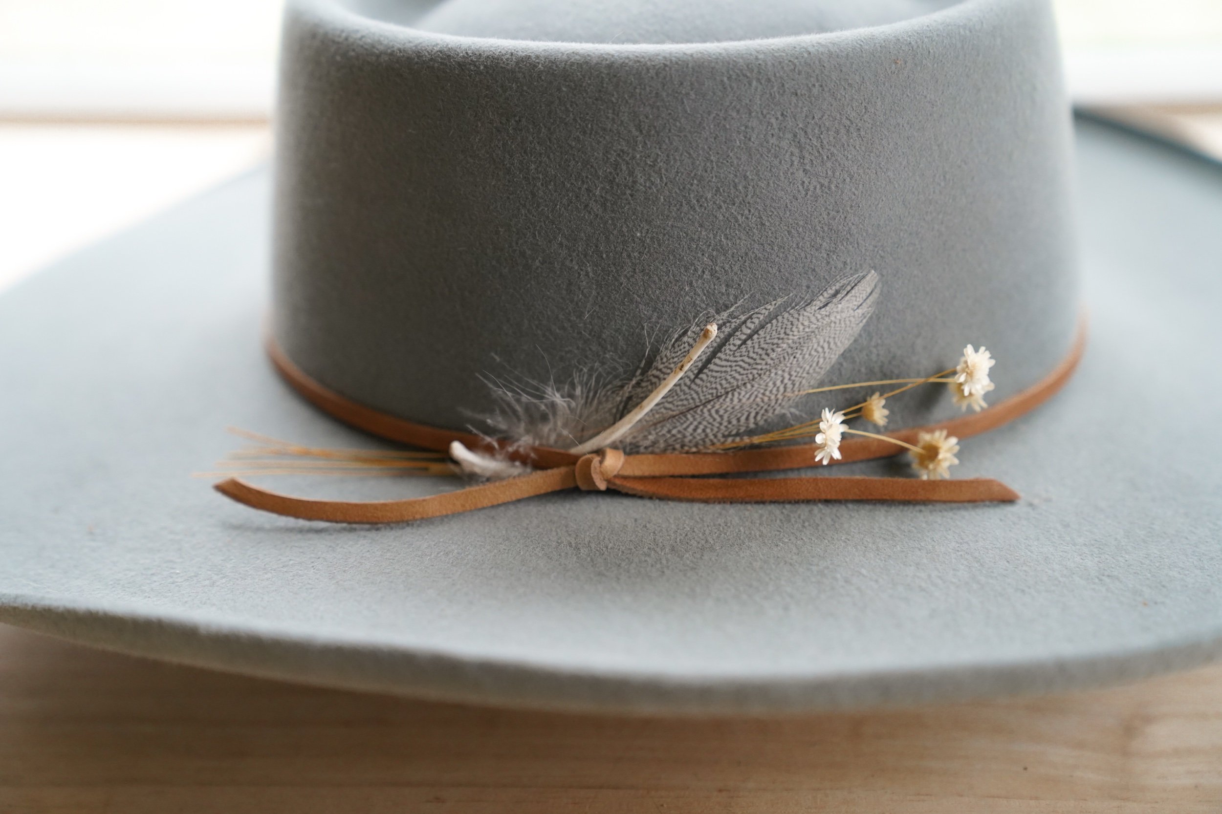 Band : Leather slip knot tie with feather, dried florals, miscellaneous animal bone